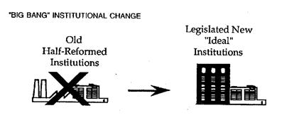 After the collapse of the socialist idea in the late 1980s and early 1990s, the question of institutional change strategies came to the forefront. Broadly speaking, two opposed strategies emerged. The Big Bang approach advocated just drawing a big X over the old half-reformed institutions and then legislating new “ideal” institutional forms.