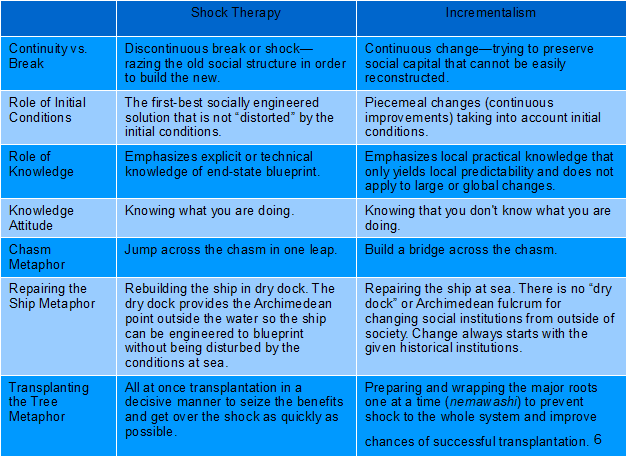 One of the important mis-formulations of the transition question was “Fast versus slow?” “Incremental” might be misleading if it is construed as “gradual” or “slow.” The Chinese reforms were neither gradual nor slow, and the Russians will not soon climb out of the chasm they failed to jump over in one leap. The point is to find and build step-by-step upon the reform efforts of the past (which requires taking into account past conditions) rather than trying to wipe the slate clean and legislate ideal institutions in one fell swoop. Murrell (1992) explored the connections between incrementalist strategies and conservative political philosophies. In Lau, Qian, and Roland (2000), the Chinese “two-track” system of reforms is analyzed where a second track, step, or stage is inaugurated and can then grow to eventually render the earlier stage obsolete. Black et al. (2000) use the word “staged” in much the same sense. In Joseph Stiglitz’s Whither Reform? (2001), the two “ideal types” were compared in a table as a “battle of metaphors.”